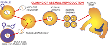 What is the process of cloning:A skin cell containing all 46 chromosomes is taken from a male. An egg cell containing only 23 chromosomes is taken from a female donor. The nuclei are removed from both cells. The nucleus from the male cell containing all 46 chromosomes is inserted into the donor's egg cell. The egg cell now contains all the things to make the male clone. The egg cell is surgically inserted into the donor's womb. 9 months later a baby is born that is a perfect genetic clone of the male.